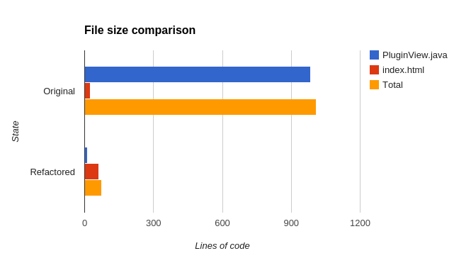 Despite the look, Alitheia Core does use a template engine named Velocity Engine from Apache. This template engine is pretty powerful but is hardly used in the project. We want to move every piece of Java code that is generating HTML to the template engine. This is a good idea because different templates and designs could easily be created and we can test the models delivering the data separately. This is a huge task and obviously we can’t do everything in this period of time, so we started by creating another Plugin-in tab with the refactored code, but having the same functionality. In this way we can check by hand if the underlying code is doing the same. The following figure represents the size of the targeted files that were refactored.