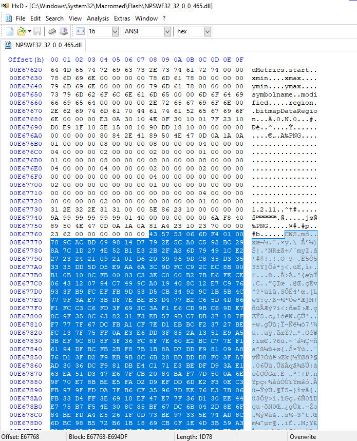 There were a few ways i thought it might work but one thing about the kill screen is that it still said "Adobe Flash Player 32" when i right clicked, and had the option for global settings and local settings this made me think that the killscreen really is just a SWF (Flash Movie) file itself, that it'll load instead of whatever is on the site, knowing this i did a very basic search looking for "CWS" the flash movie magic number inside the DLL, and i found a few results: image