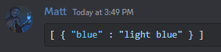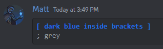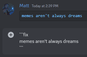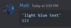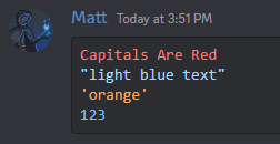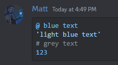 Discord also supports code blocks as well. You can make your own code blocks by wrapping your text in backticks (`)