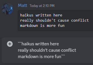You can also use three backticks (```) to create multiline code blocks, like this beautifully written haiku.
