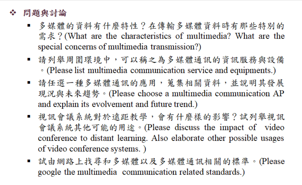 HomeWork1 多媒體有什麼特性? 媒體技術具有的特性包括:多樣性、集成性、交互性、數字化、超媒體 在資料傳輸需求上,會因資料不同而相異 多種媒體的整合:多媒體是多種單媒體,如文本、圖形、動畫、圖像、聲音的。這種整合是通過電腦實現的。