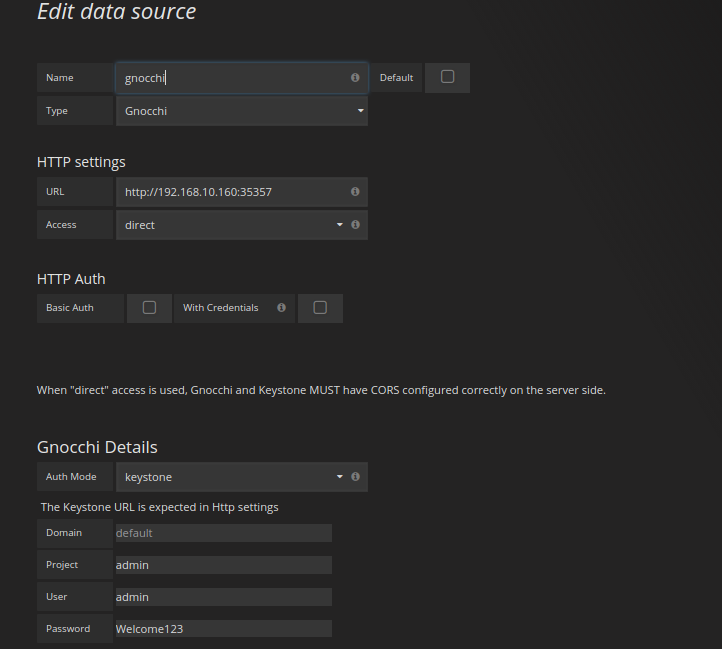 - Configure a new datasource in Grafana with the Gnocchi URL. If you are using the Keystone middleware for authentication, you can also provide an authentication token.