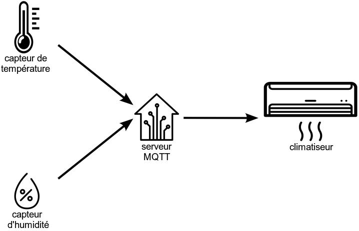 Le programme de domotique est abonné auprès du courtier MQTT pour recevoir toutes les messages aux sujets de la «température», de la «pression» et de l'«état du climatiseur». Le climatiseur est abonné auprès du serveur MQTT pour recevoir toutes les messages sur le thème «climatisation».