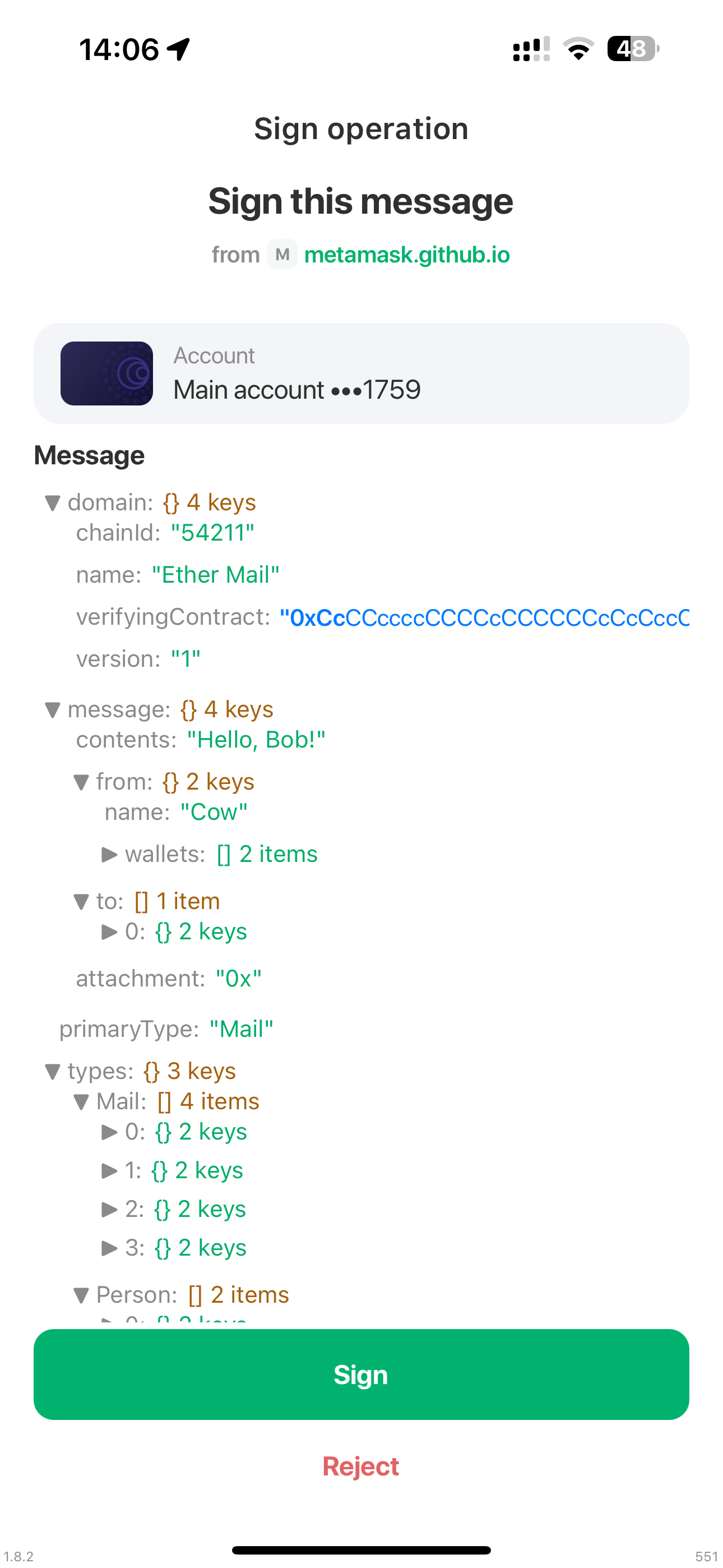 domain[1] - DAPP domain URL addressmessage_or_input[2] - string message from DAPP or smart contract input data (value can be0x0)- example: