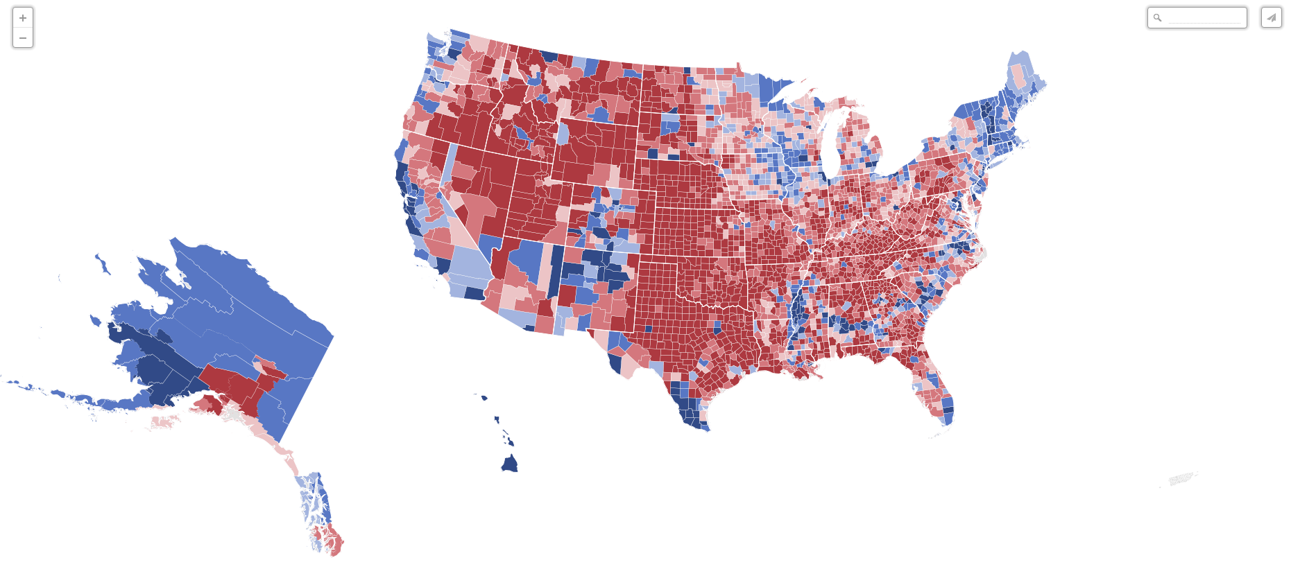 - As a first step, let's color each county based on the winner using the color variables for each candidate based on the