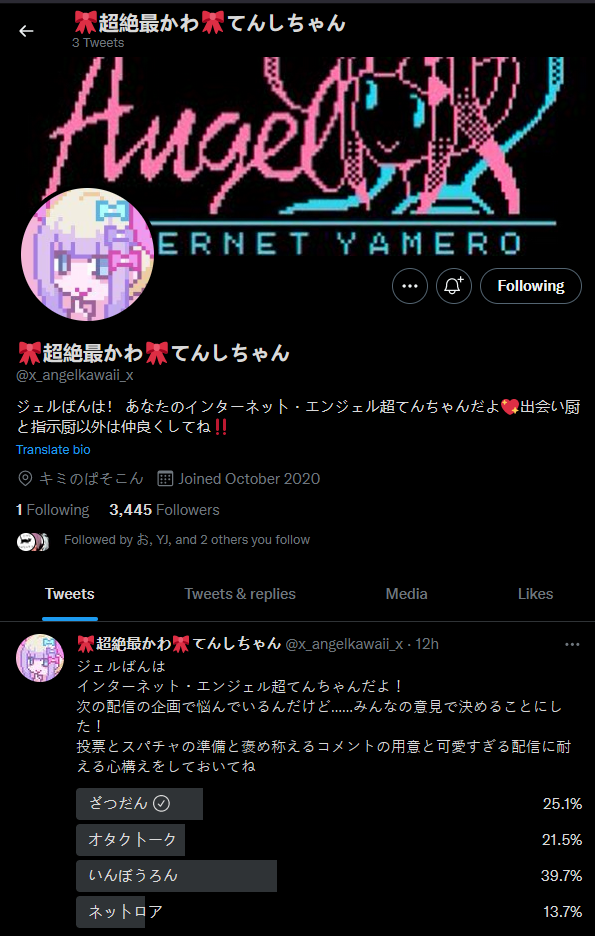 ["Ngocredits", "tweet_selfie_ame_cool_001", "tweet_selfie_ame_cry_001", "tweet_selfie_ame_game_001", "tweet_selfie_ame_happa_001", "tweet_selfie_ame_happy_001", "tweet_selfie_ame_happy_002", "tweet_selfie_ame_home_001", "tweet_selfie_ame_home_002", "tweet_selfie_ame_line_smile_001", "tweet_selfie_ame_odekake_001", "tweet_selfie_ame_odekake_002", "tweet_selfie_ame_sorrow_001", "tweet_selfie_ame_talk_001", "tweet_selfie_cho_akkanbe", "tweet_selfie_cho_angel_001", "tweet_selfie_cho_av", "tweet_selfie_cho_av_ch", "tweet_selfie_cho_av_eng", "tweet_selfie_cho_cosplay_001", "tweet_selfie_cho_cosplay_002", "tweet_selfie_cho_cosplay_003", "tweet_selfie_cho_grand_end_001", "tweet_selfie_cho_grand_end_002", "The Twitter account @x_angelkawaii_x is followed by the writer of NGO, @nyalra which gives a lot of credence to this account being legit.