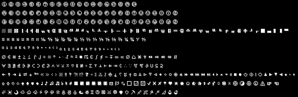 tellraw @a "\n ☲ ☵ ☰ ☱ ☳ ☴ ☶ ☷ ⅒ ⅘ ⅛ ⅜ ⅝ ⅞ ⅓ ⅔ ⅐ ⅑ ⅕ ⅖ ⅗ ⅙ ⅚ ⅟ ↉"