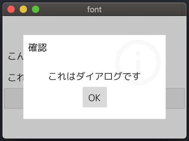 以下のような簡単なサンプルアプリケーションで確認してみます. ラベル, ボタンがあり, ボタンを押すとダイアログが表示されます.