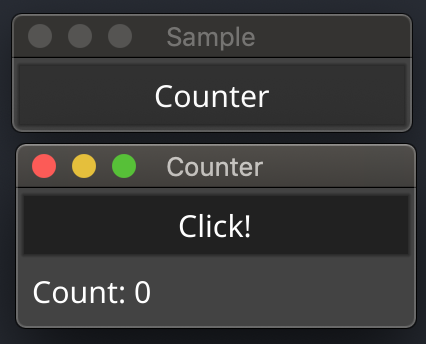起動するとメインウインドウが開き, "Counter" をクリックすることでカウンターのウインドウが開きます. カウンターでは, ボタンをクリックするたびにカウント表示をインクリメントします.