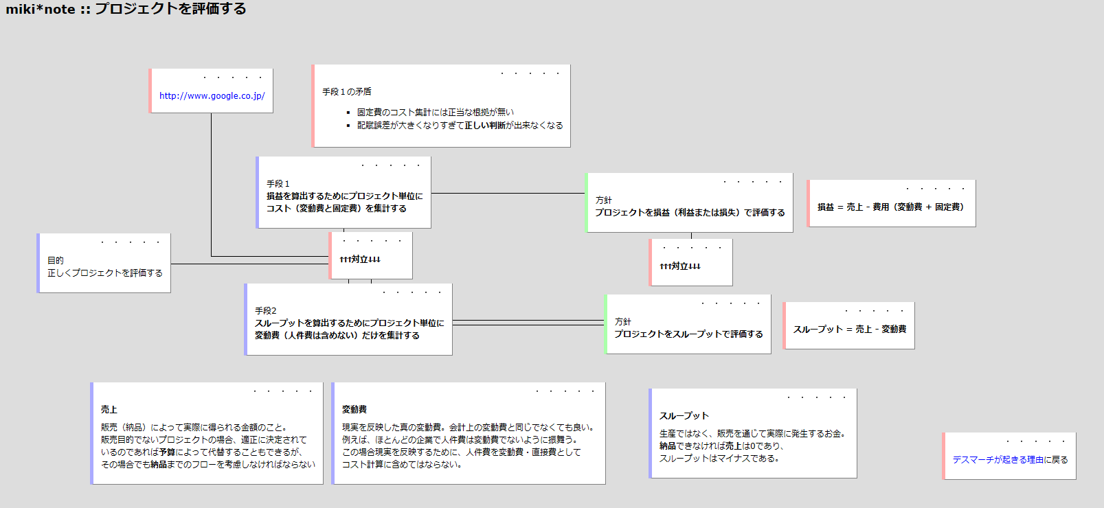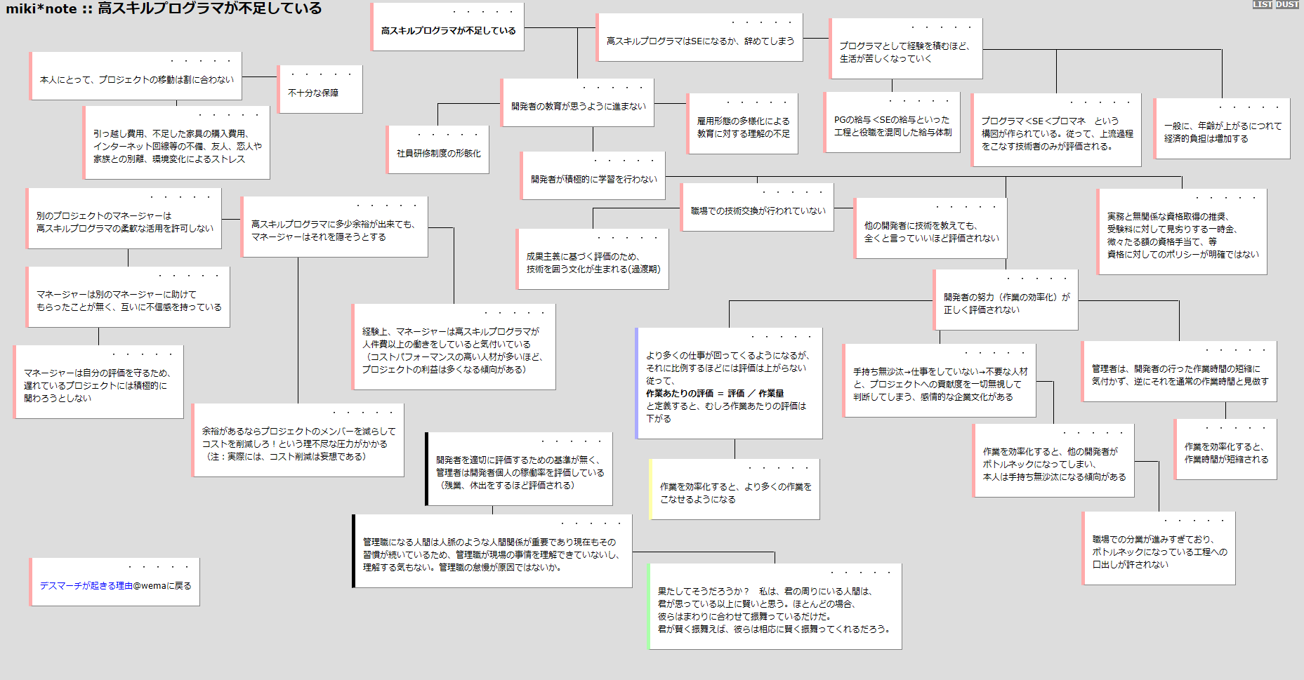『デスマーチ』の現状問題構造ツリー 当時のサイトが無くなってしまいスパムサイトになっています http://www.mikihoshi.com/wiki/index.cgi?page=%A5%C7%A5%B9%A5%DE%A1%BC%A5%C1