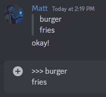Discord also supports code blocks as well. You can make your own code blocks by wrapping your text in backticks (`)