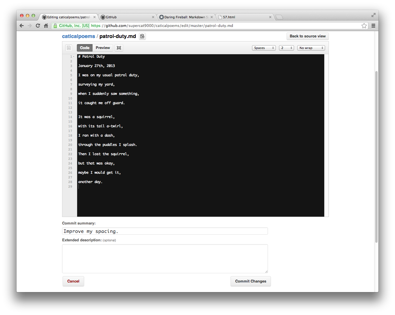It turns out supercat9000 made a mistake. He didn't space his lines enough. Thankfully, with the power of GitHub, we can change that. Click on the file, and choose Edit. You now have the same editor again, so make your changes:
