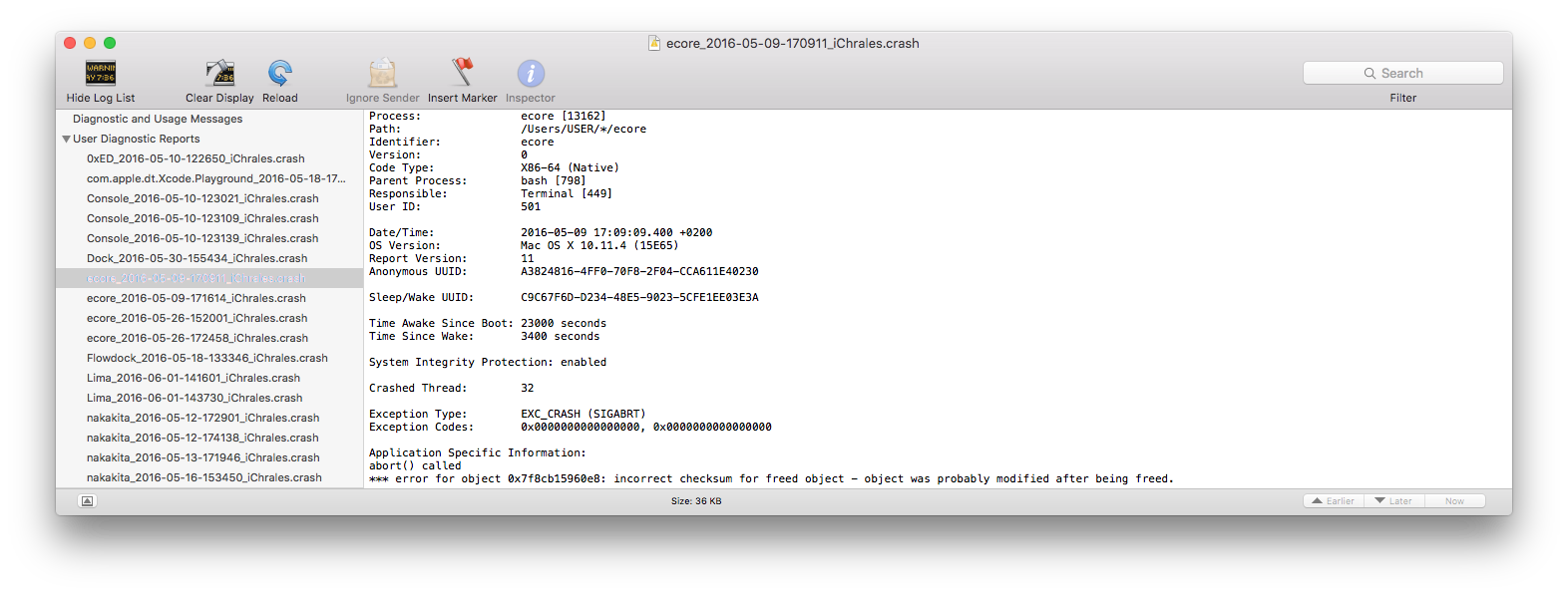 3. Look a file starting with the name of the app/executable that crashed. In this example, ecore has crashed, the file is named ecore_2016-05-09-170911_iChrales.crash
