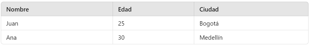 <table>: Define el inicio y el final de la tabla.<tr>: Define una fila de la tabla.<th>: Define una celda de encabezado, que generalmente se utiliza para títulos de columnas.<td>: Define una celda de datos en la tabla.- <caption> define titulo de una tabla