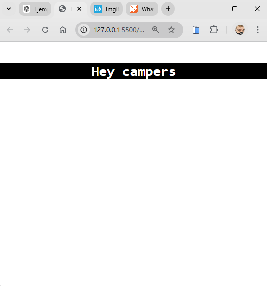 <!DOCTYPE html> <html lang="en"> <head> <meta charset="UTF-8"> <meta name="viewport" content="width=device-width, initial-scale=1.0"> <link rel="stylesheet" href="css/styles.css"> <title>Document</title> </head> <body> <h1 class="title">Hey campers</h1> </body> </html>