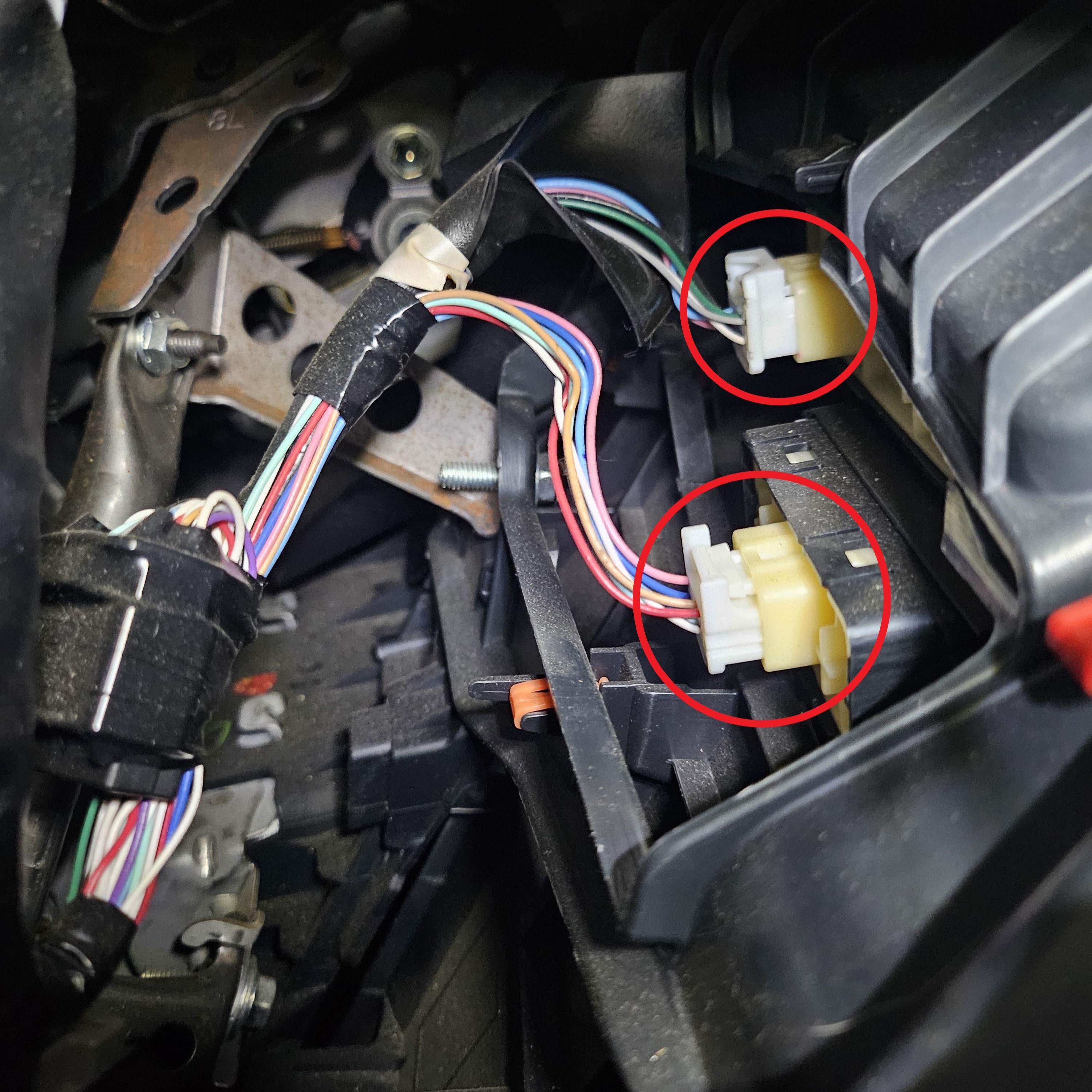 Next, remove the trim above the footwell by unscrewing the two Phillips screws, disconnecting the white LED cable, and tugging down. These types of cables will be seen everywhere and can be disconnected by pushing down on the small tab and pulling.